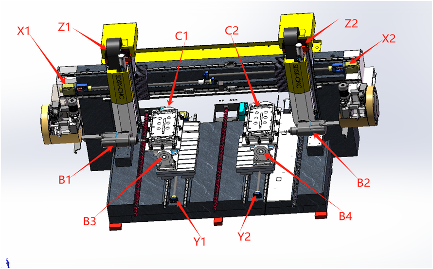 數(shù)控系統(tǒng)(雙頭雙通道);(品牌廠家待確認) X1X2軸(型號待確認)伺服電機; Y1Y2軸(型號待確認)伺服電機; Z1Z2軸(型號待確認)伺服電機、帶抱閘; B1B2軸(型號待確認)伺服電機、帶抱閘; B3B4軸(型號待確認)伺服電機、帶抱閘; C1C2軸(型號待確認)伺服電機、帶抱閘; 2-主軸電機15-18000; |